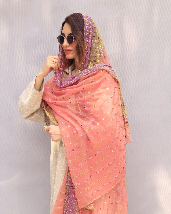 روش‌های ست کردن شال هندی پولک‌دوزی گلبهی بنفش